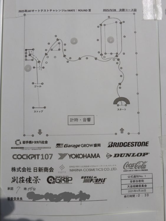 パイロン(マーカー)を置いて設定したコースを1台ずつ走り、走行タイムと途中のペナルティが最も少なかった人が優勝となります。