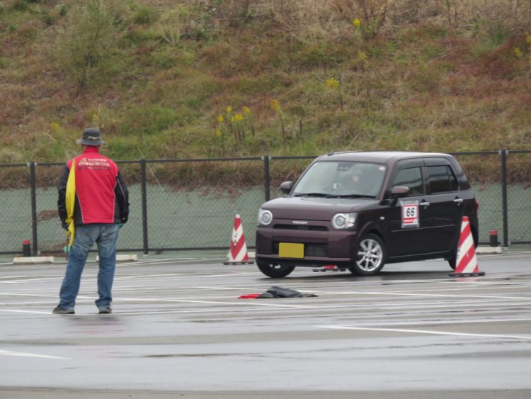 パイロン(マーカー)を置いて設定したコースを1台ずつ走り、走行タイムと途中のペナルティが最も少なかった人が優勝となります。