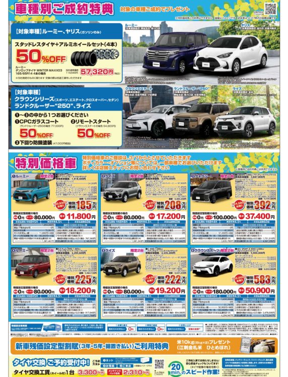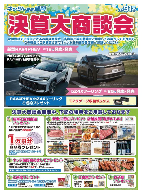 3月おすすめ情報 2026-02-28 up 3月は「決算大商談会」を開催!この時期ならではの特別価格車や、ご成約特典を多数ご用意。 新生活をスタートされる方、「そろそろ車を買い替えかな?」とお考えの方…などぜひこの機会にご相談ください😊 ■春のタイヤ交換ご予約受付中🚗ご予約はこちらから ■ご試乗予約はこちらから ■ご商談予約はこちらから ■春のタイヤ交換もご予約受付中!ご予約はこちらから ■ご試乗予約はこちらから ■ご商談予約はこちらから Home › お知らせ › 3月おすすめ情報 bZ4Xツーリング登場